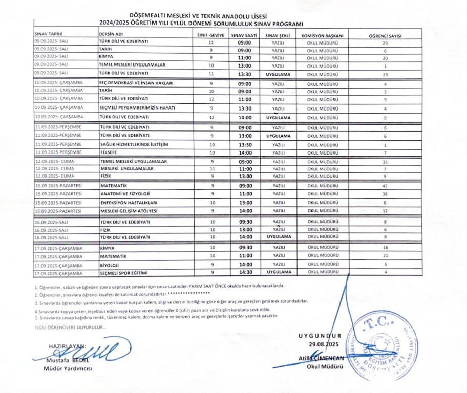 EYLÜL DÖNEMİ SORUMLULUK SINAV PROGRAMI